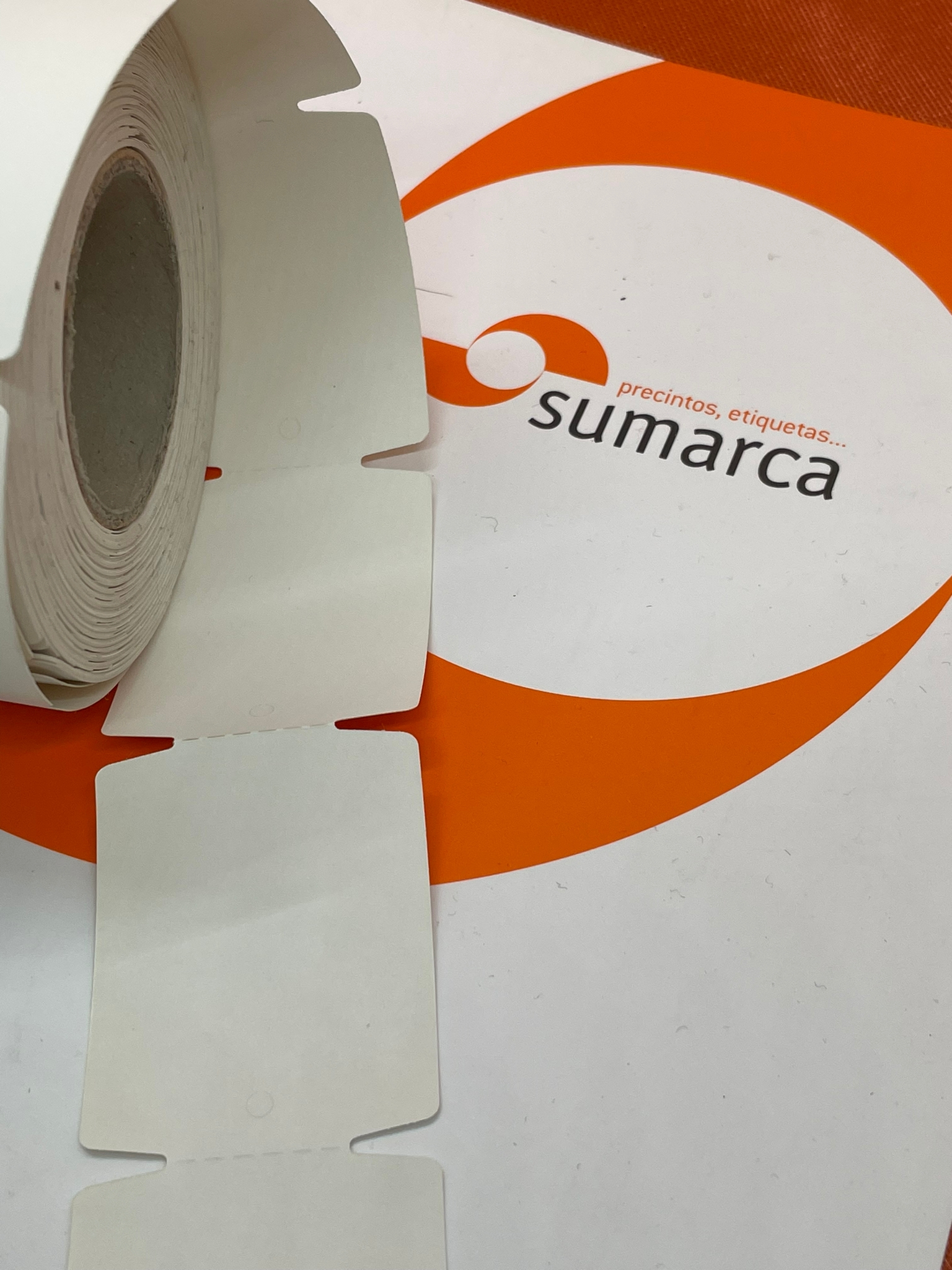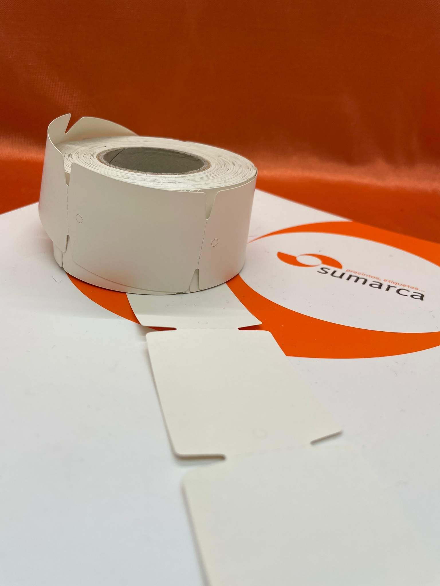 Etiqueta cartulina blanca 50×67,5mm, con troquel para navet, presentado en rollos.