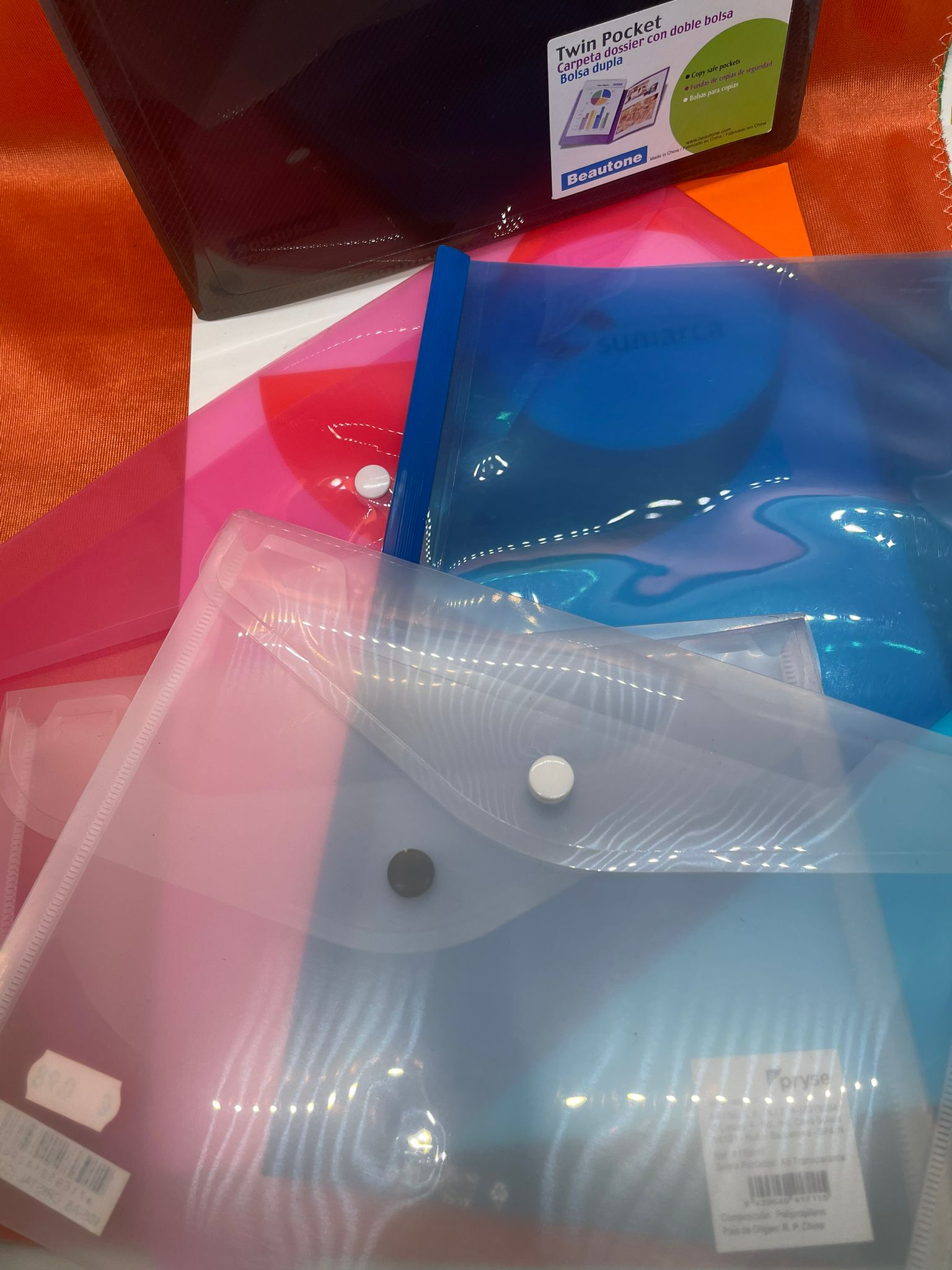 Carpetas para documentos de diferentes materiales, tamaños y estilos, dependiendo de sus necesidades. Tanto transparentes, como de colores, y de diferentes materiales y cierres disponibles. (Cierre de botón, de goma elástica…).