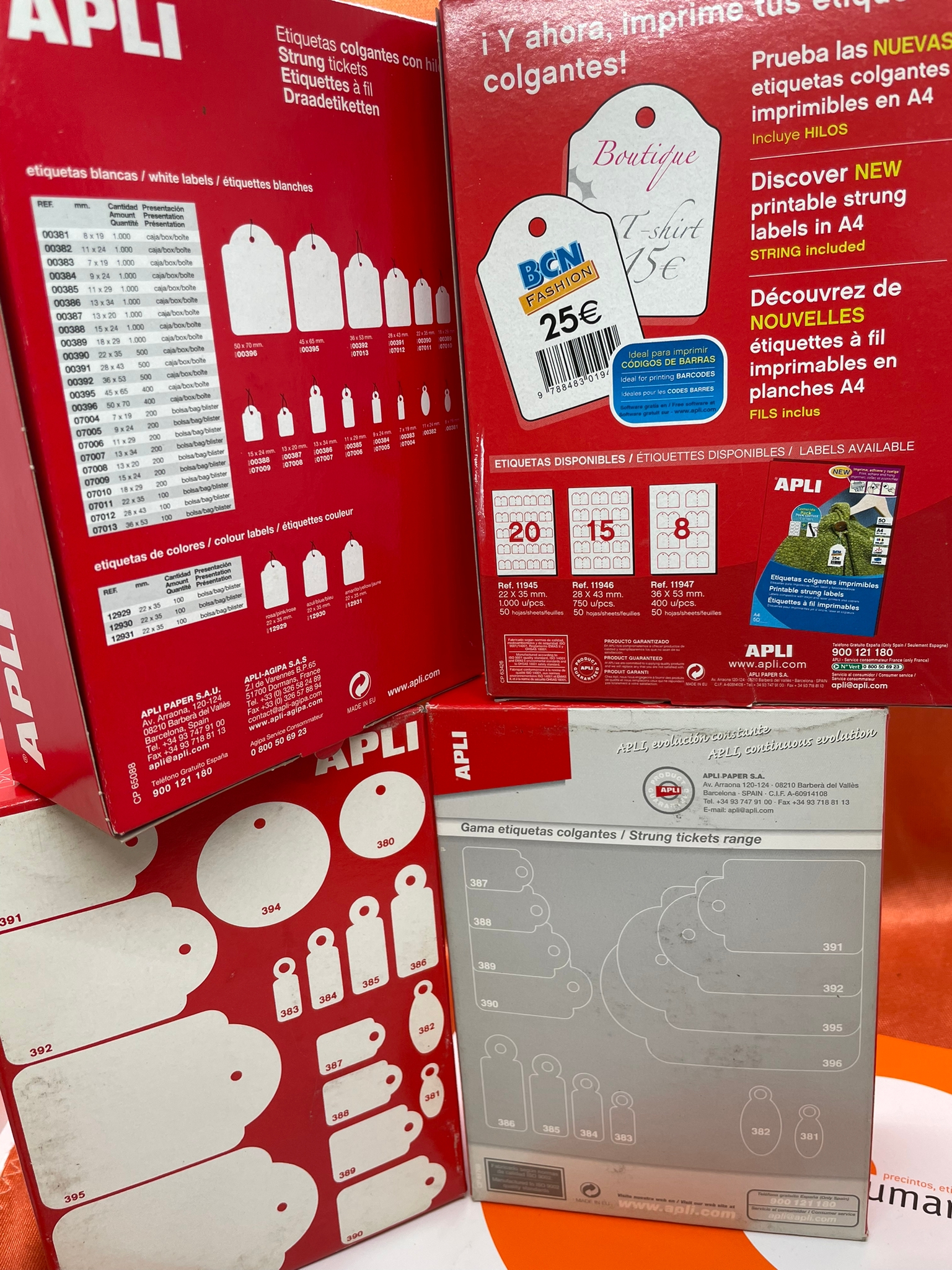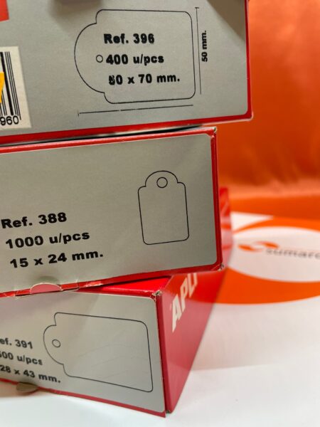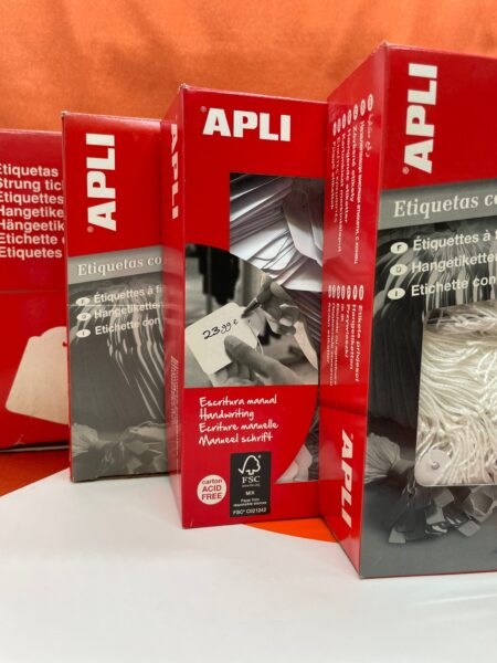 Etiqueta cartulina blanca Apli, con hilo para colgar manual. Diferentes formas, modelos y tamaños disponibles, según las necesidades de su negocio.
