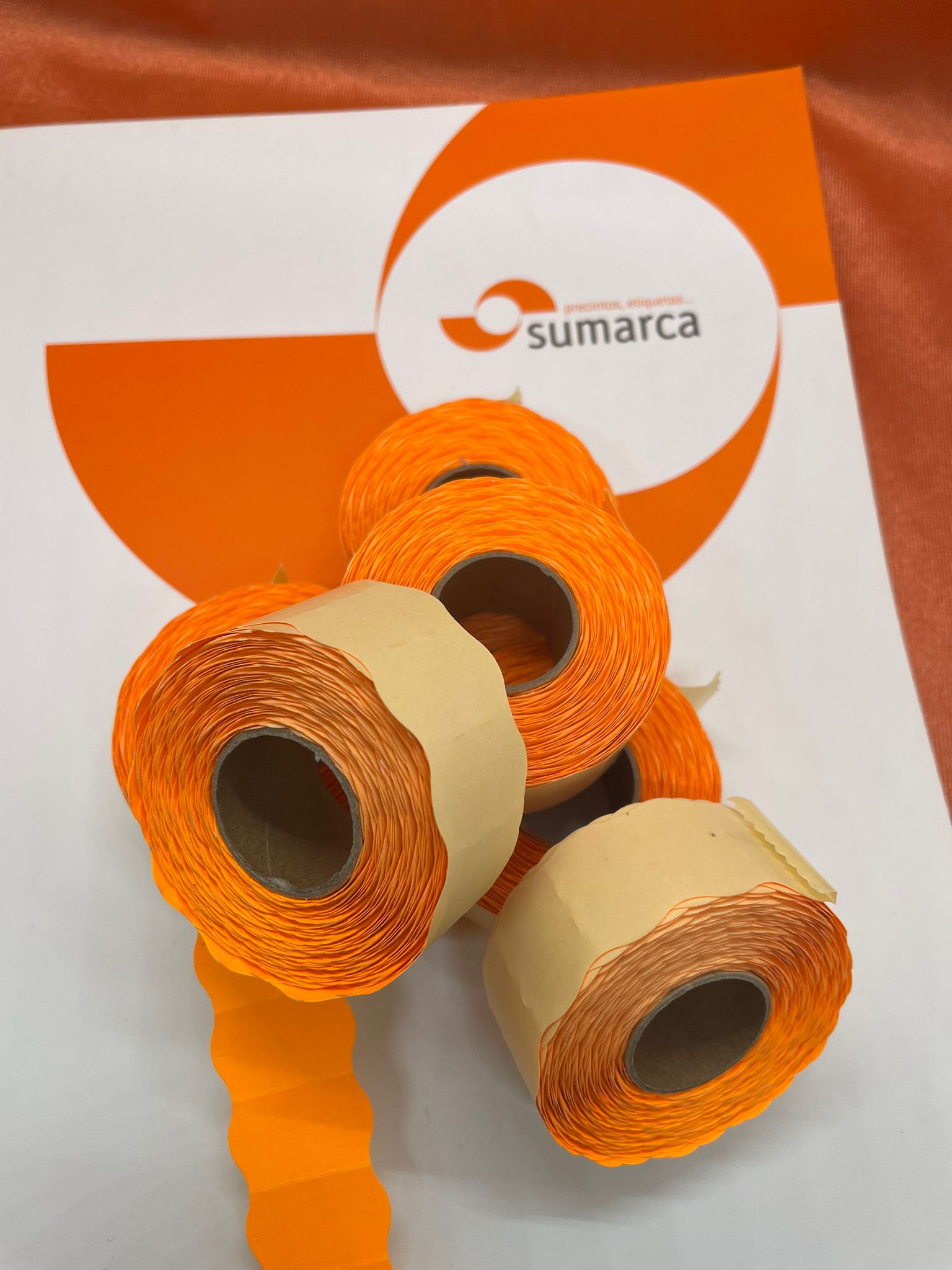 Rollos etiquetas adhesivas flúor naranja para máquina etiquetar. Medidas 12×22,…