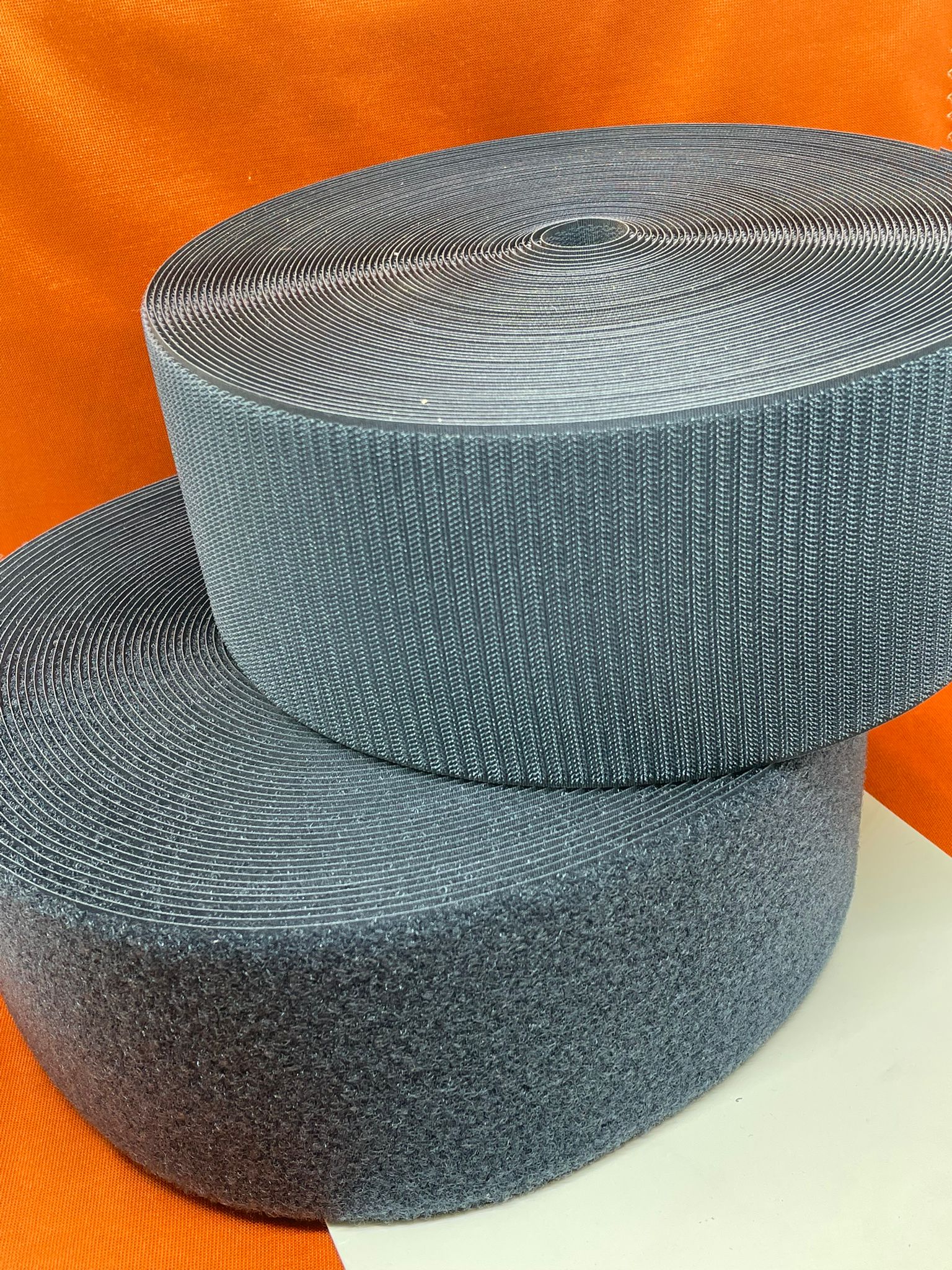 Disponemos de rollos de velcro de cierre, parte suave y parte pincho, color marino, para la fabricación de sus productos.